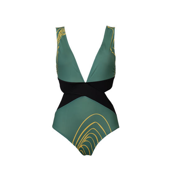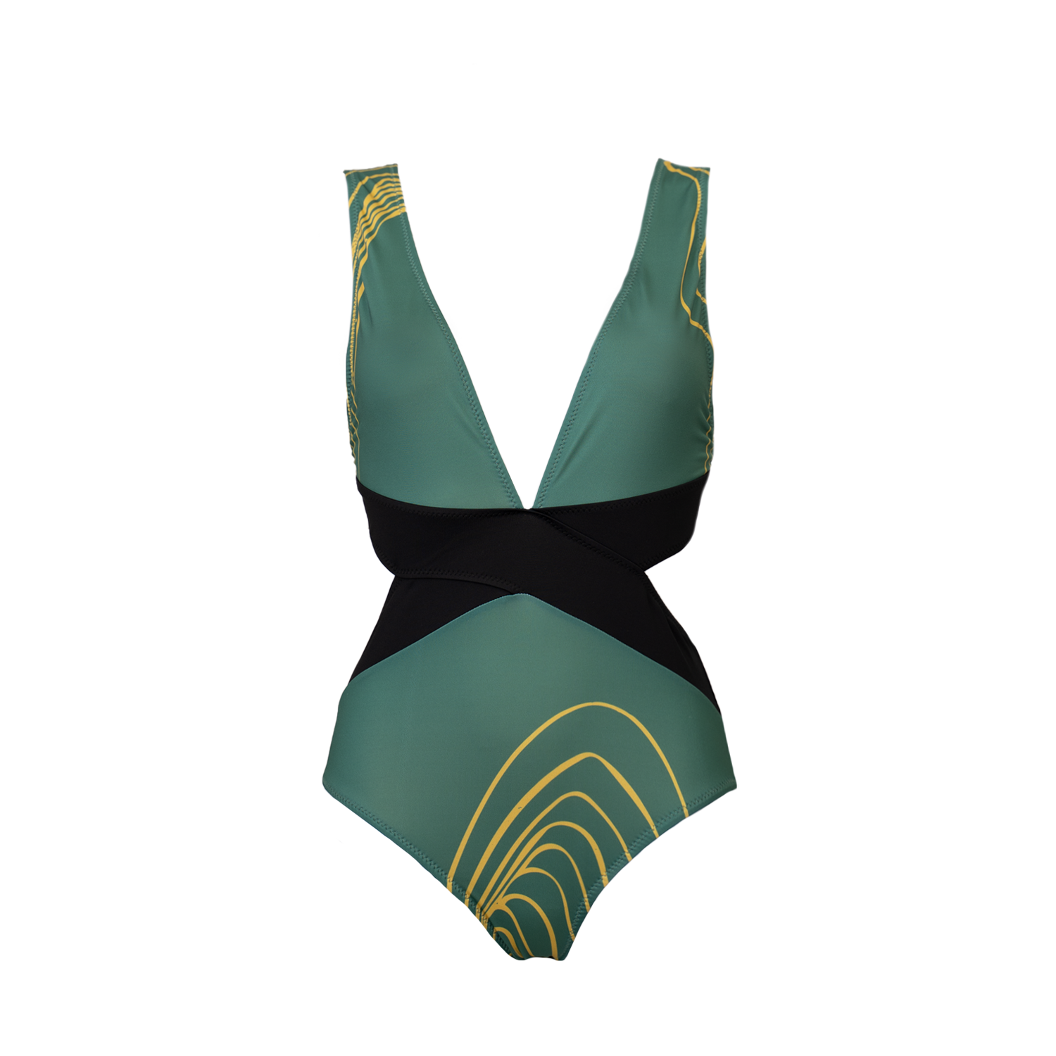 Ce maillot une pièce chic présente un décolleté en V plongeant ainsi que des découpes latérales qui épousent les courbes au-dessus de chaque hanche. Les bandes noires contrastent avec les motifs de vibration sonores inspirés des musiques du groupe de musique Frost.