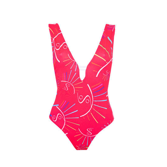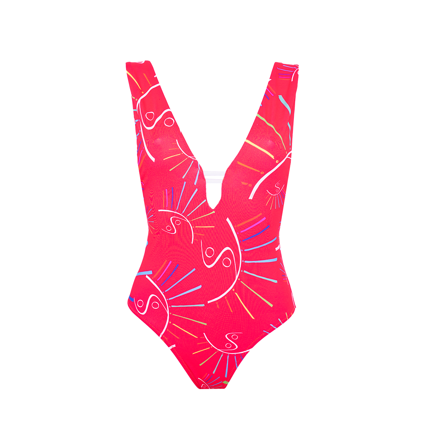 Ce maillot de bain présente un profond décolleté en V maintenu en place grâce à des élastiques au niveau de la poitrine. Ses liens à nouer au dos, vous permettront de l'ajuster parfaitement à votre silhouette. Les motifs de vibration sonores sont inspirés des musiques du groupe de musique Frost.