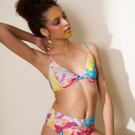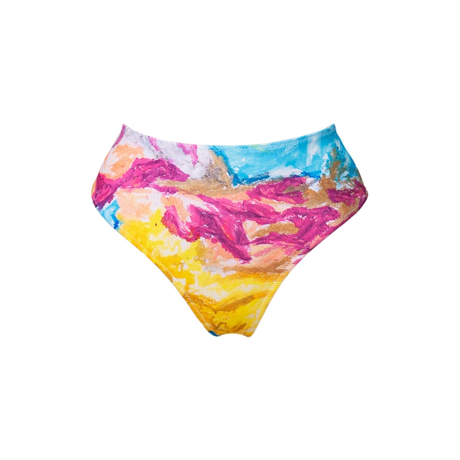 Craquez pour ce bas de maillot de bain à la coupe taille haute pour galber votre silhouette. Il est orné d'un motif multicolore inspiré de l'aquarelle Helio de l'artiste fuchsia.