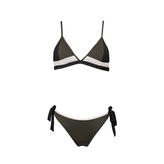 Ce maillot de bain au design patchwork saura vous séduire. Le bas de bikini est une culotte avec des liens à nouer sur les hanches.