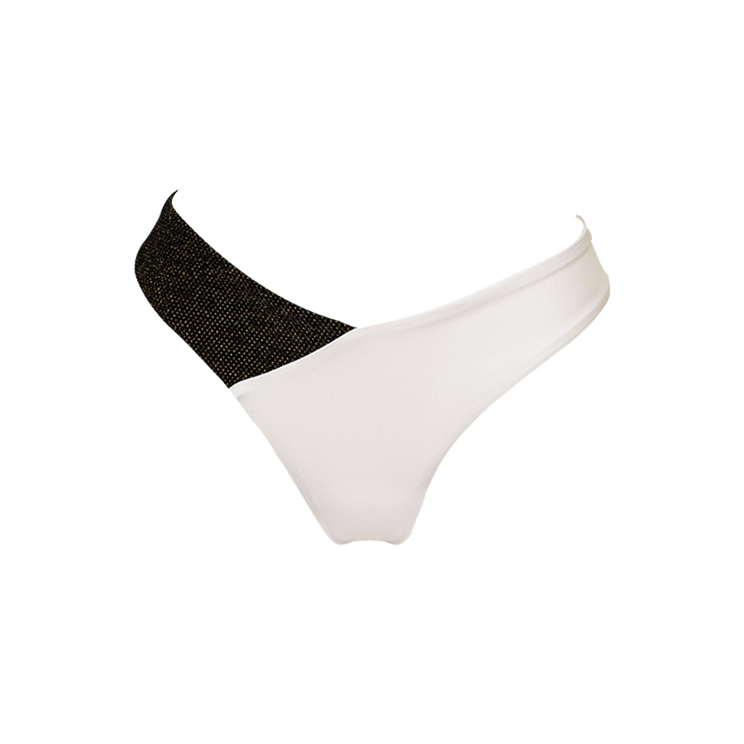 Ce bas à la coupe tanga est lui aussi asymétrique en mélangeant un bleu marine uni ainsi que du tissu à fil doré, faisant écho à la fine bande dorée sous le haut triangle. Son style asymétrique reflètera les différentes parties de votre personnalité.
