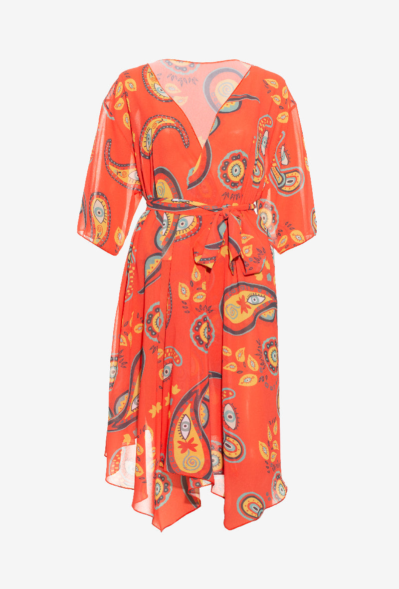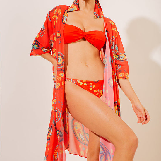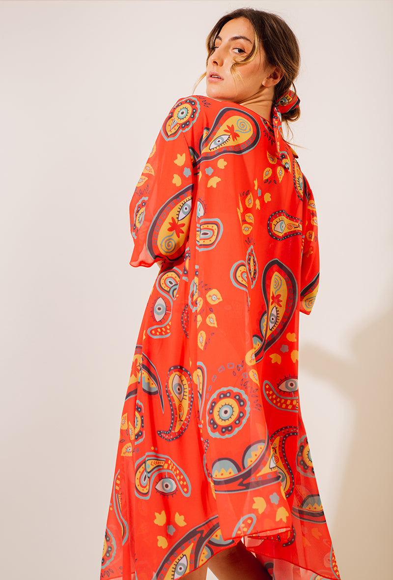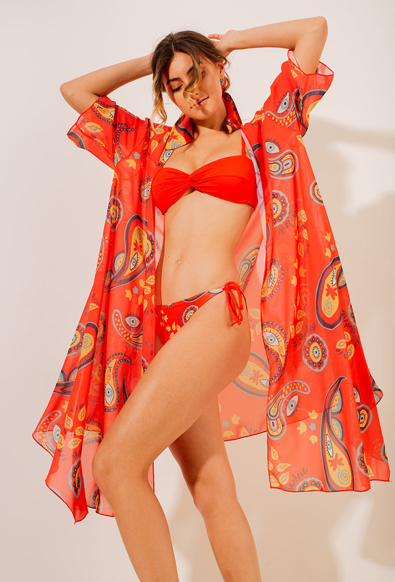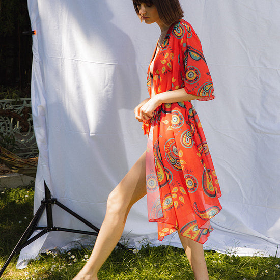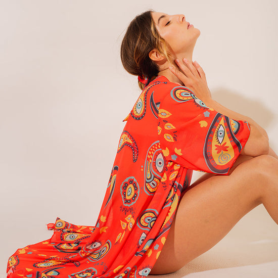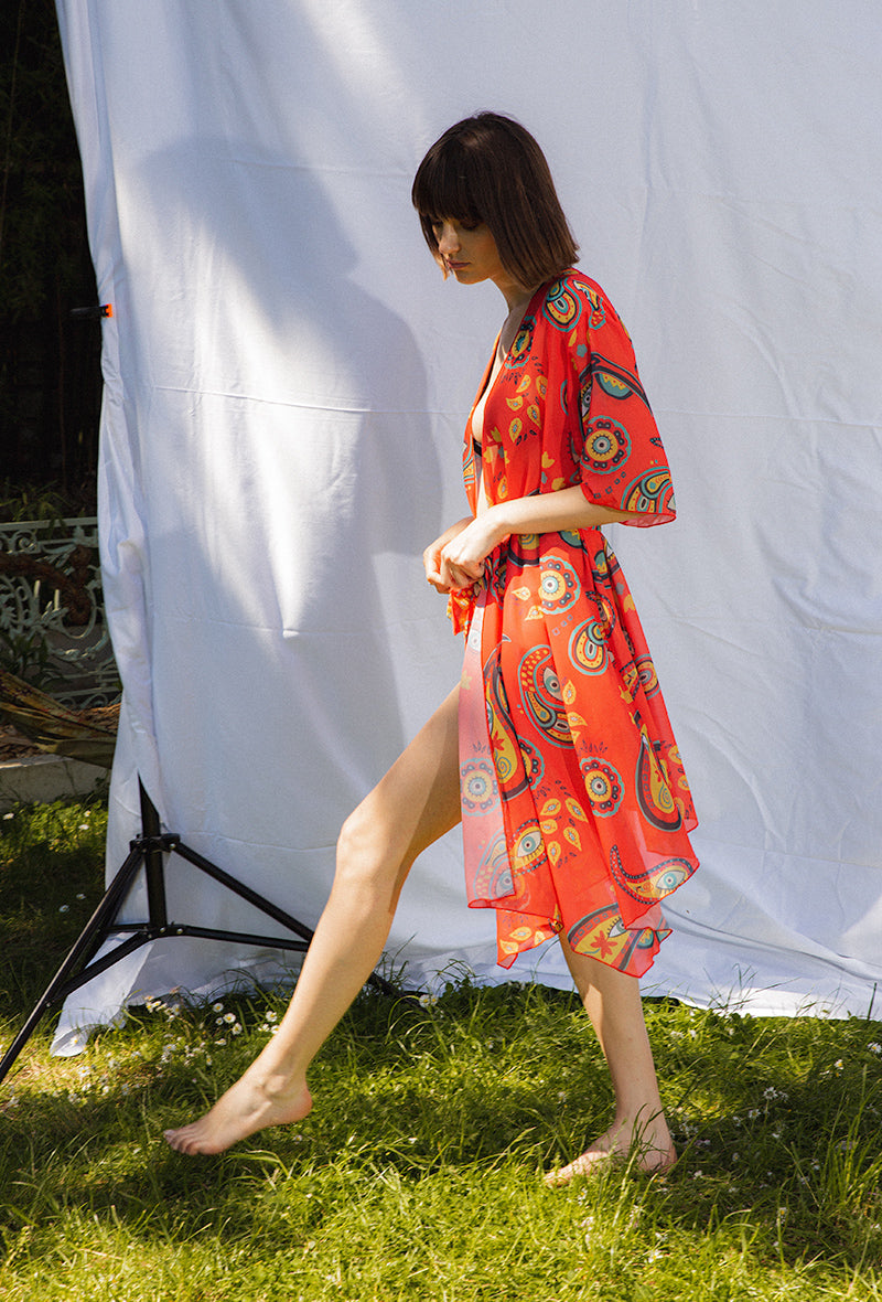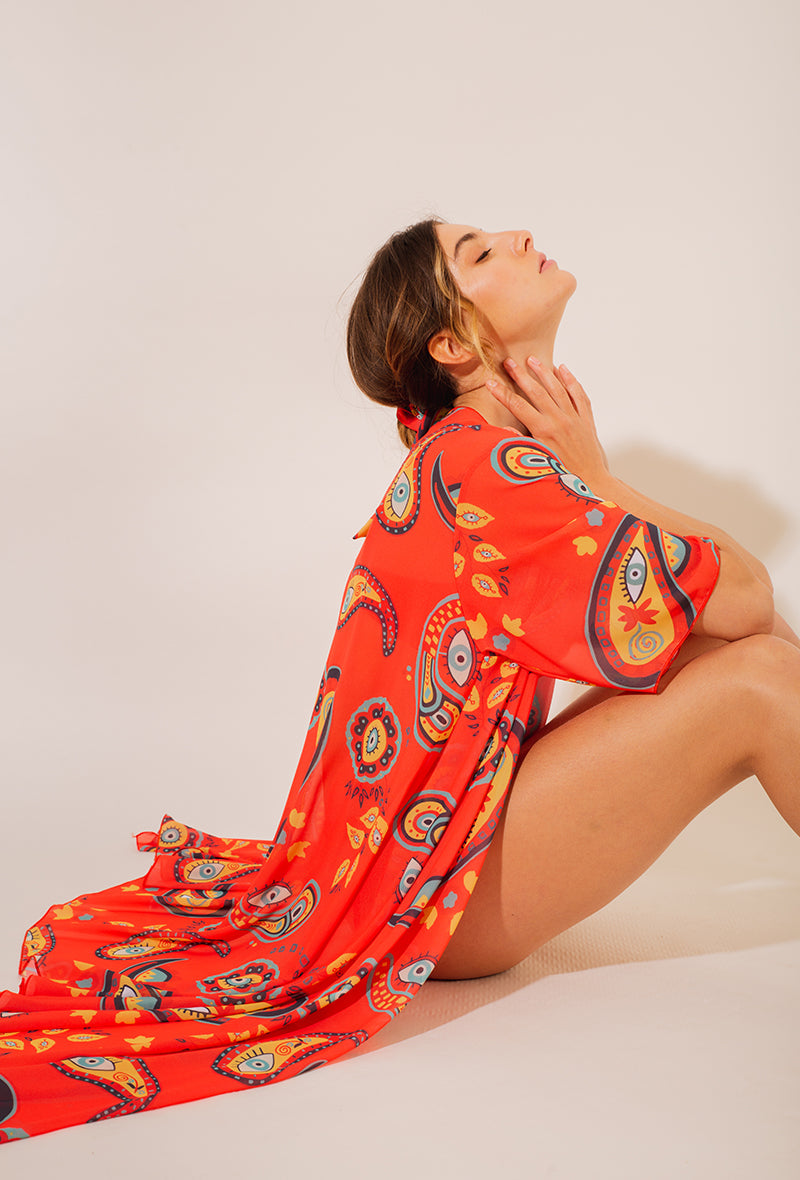 Accessoirisez votre tenue avec ce kimono inspiré des œuvres de MOON. Ce kimono léger et fluide présente une coupe élégante avec des manches évasées et des coutures inférieures légèrement asymétriques. Parfait pour couvrir vos épaules avec un voile léger et légèrement transparent.