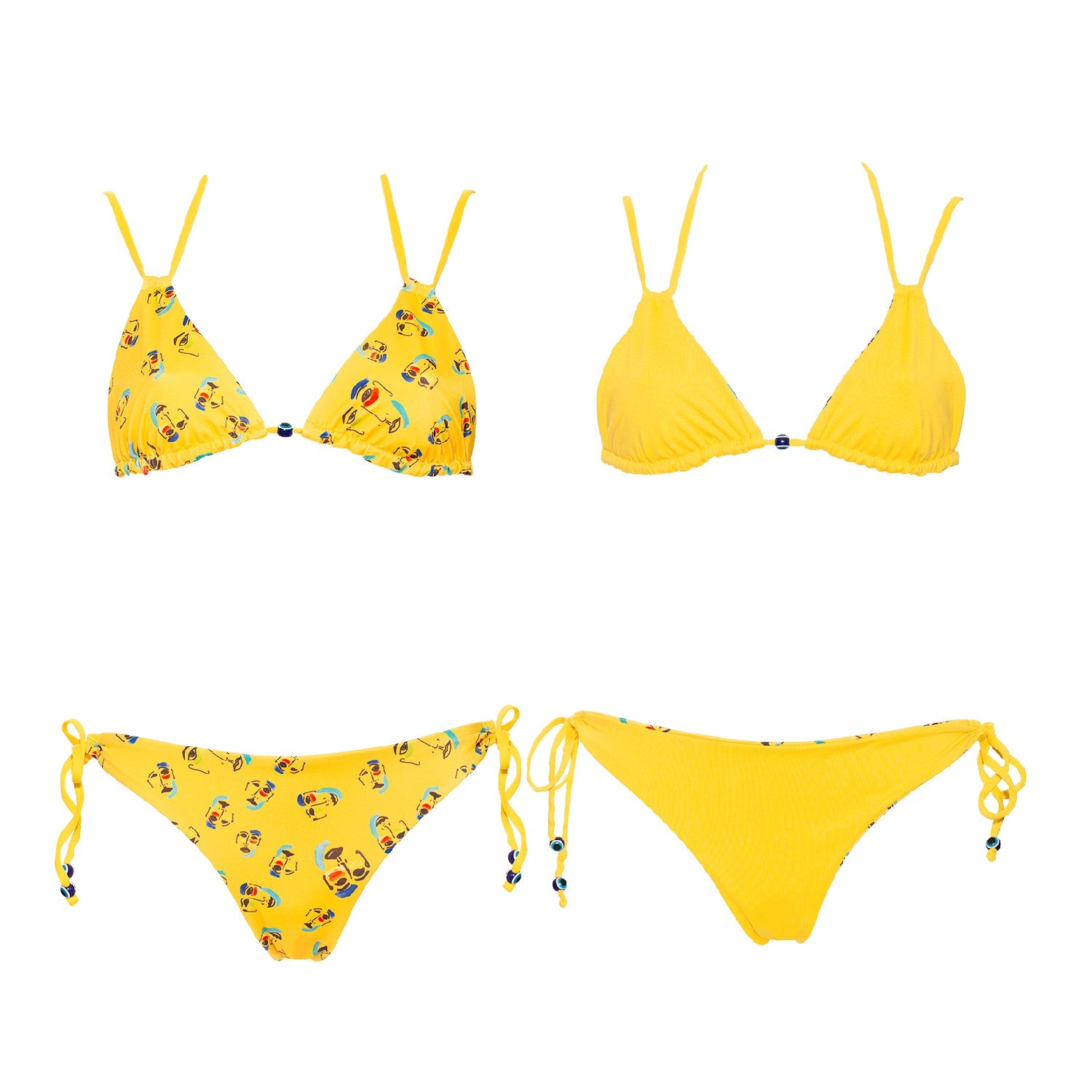 Ce maillot de bain triangle et sa culotte légèrement échancrée tirent leur originalité dans les couleurs pétillantes choisies ainsi que par les perles qui rappellent l’œil qui est souvent dessiné par l’artiste. Le maillot de bain est entièrement réversible, pour choisir le côté imprimé ou uni selon votre préférence, vous permettant d’avoir plusieurs combinaisons possibles avec un seul maillot de bain. Ajustable par les ficelles, il s'ajuste parfaitement pour un confort optimal.