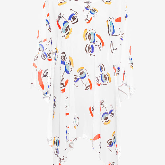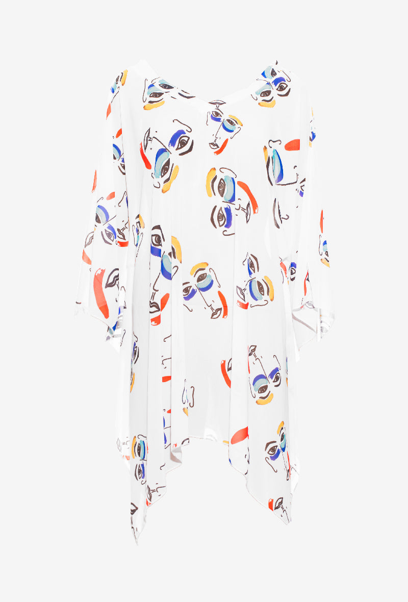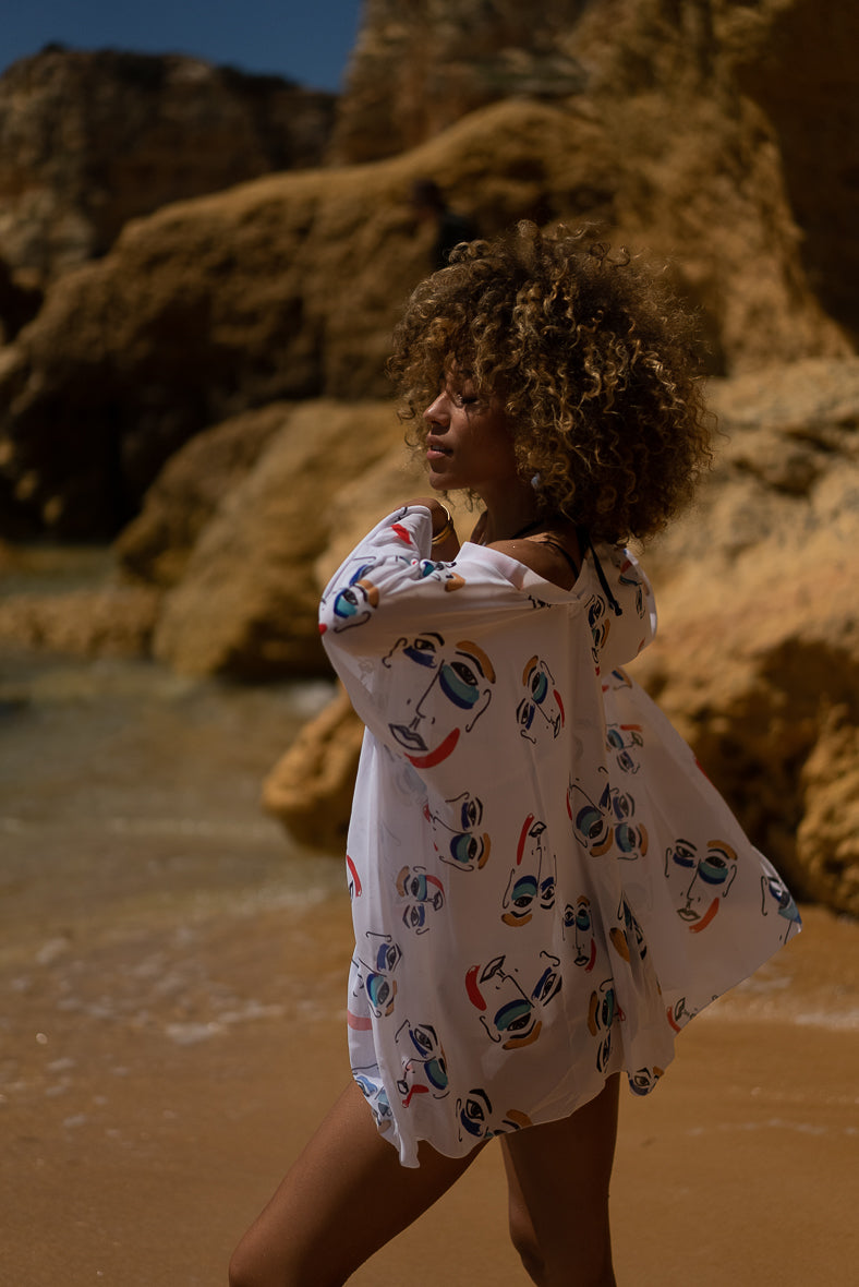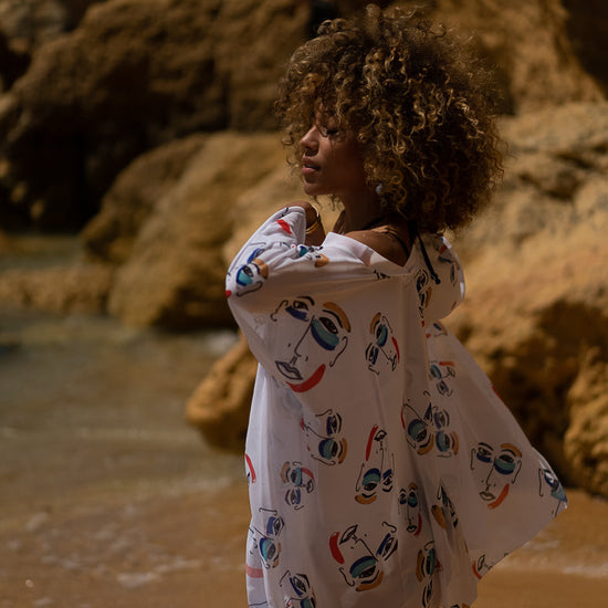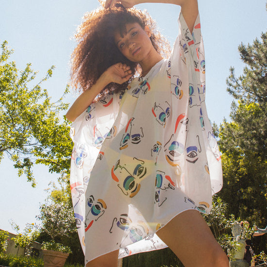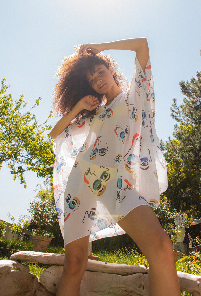 Ce Kimono léger et fluide est un accessoire plein d’histoire et de créativité que nous désirons vous partager. Les motifs sont inspirés d’un jeune artiste, pour ajouter une touche de couleur à votre tenue de l’été. Ses manches amples et la coupe du bas légèrement asymétrique rendent cette pièce originale, tout en transparence.