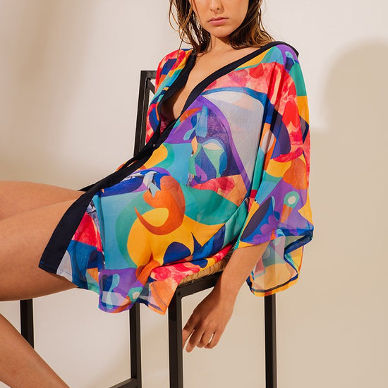 Kimono mi long de plage, multi-couleur, inspiration artistique. Manches 3/4 larges. Matière fluide et semi transparente, qui apporte un confort et séchage rapide.