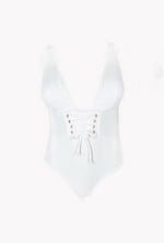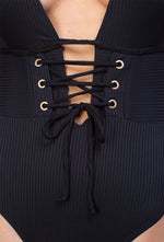Maillot de bain une pièce moderne. Le décolleté et la fermeture par lacets sur le devant offrent une touche d'originalité au maillot. La matière légère et travaillée le rend agréable à porter.