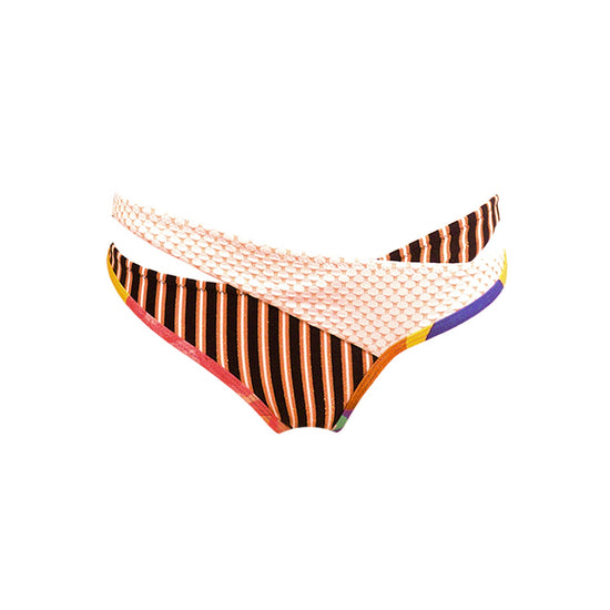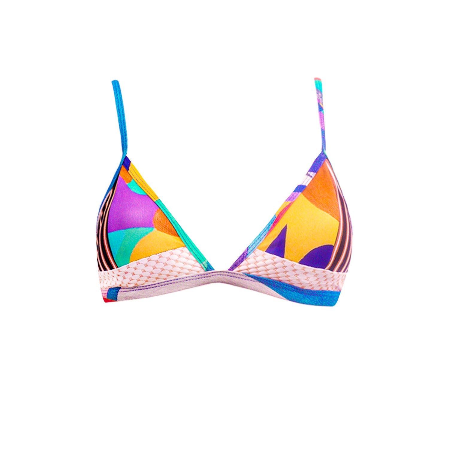 Maillot de bain 2 pièces, design patchwork. Haut triangle sans coques, ni armatures mais avec bretelles ajustables. Le bas non ajustable, original par son effet croisé.