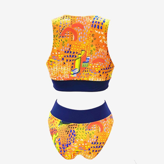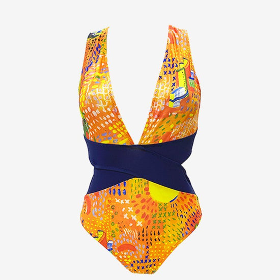 Maillot de bain 1 pièce non ajustable, couleurs solaires, inspiration artistique, effet trikini. Décolleté V, et ouverture sur les cotés. Élastiques de soutien à la taille et matière stretch qui apporte un certain confort.