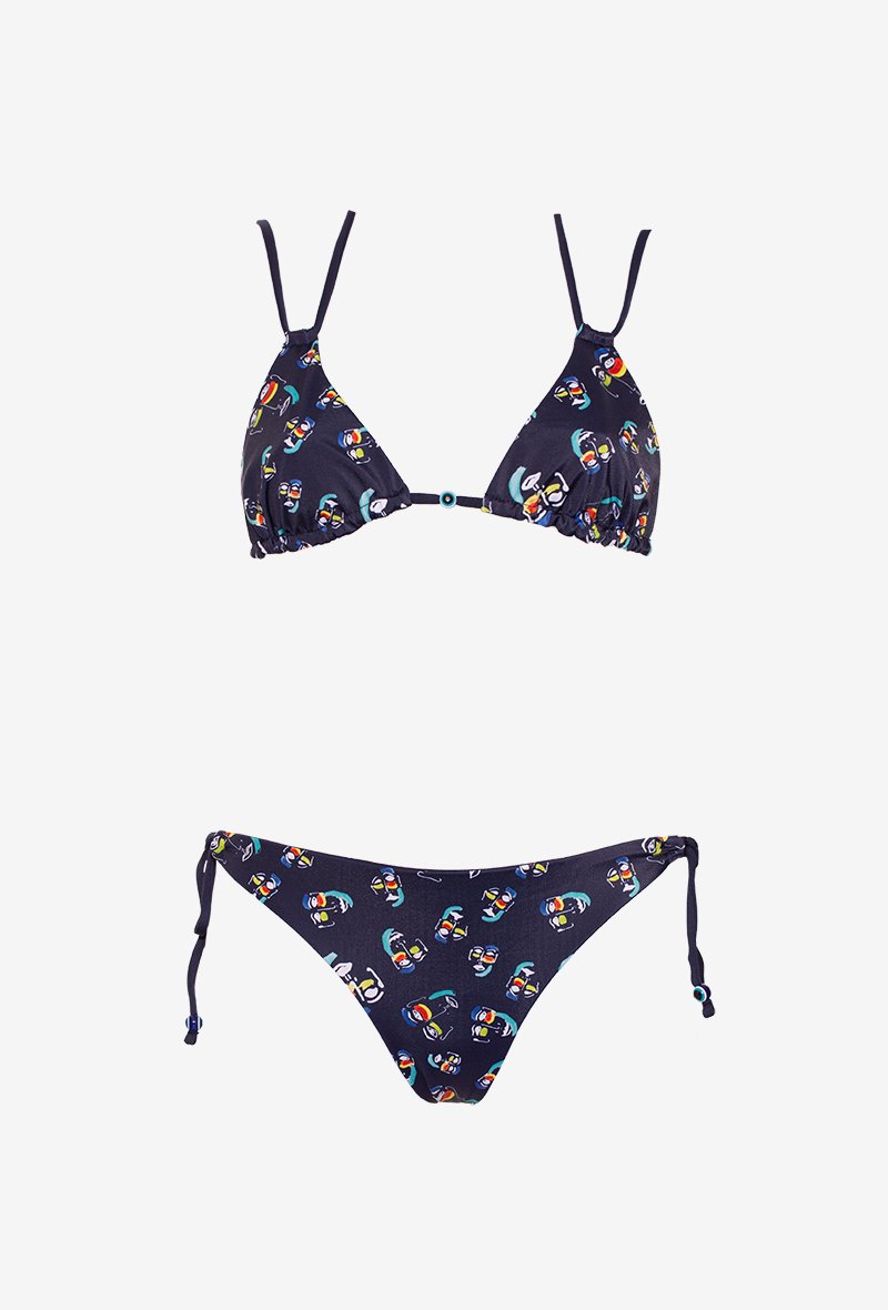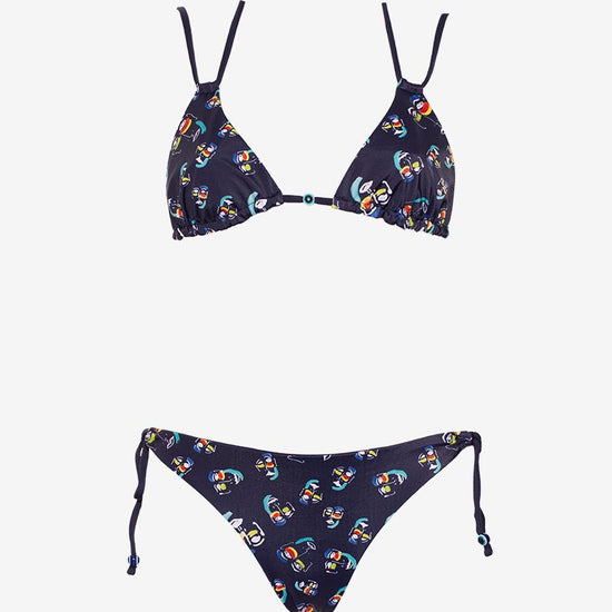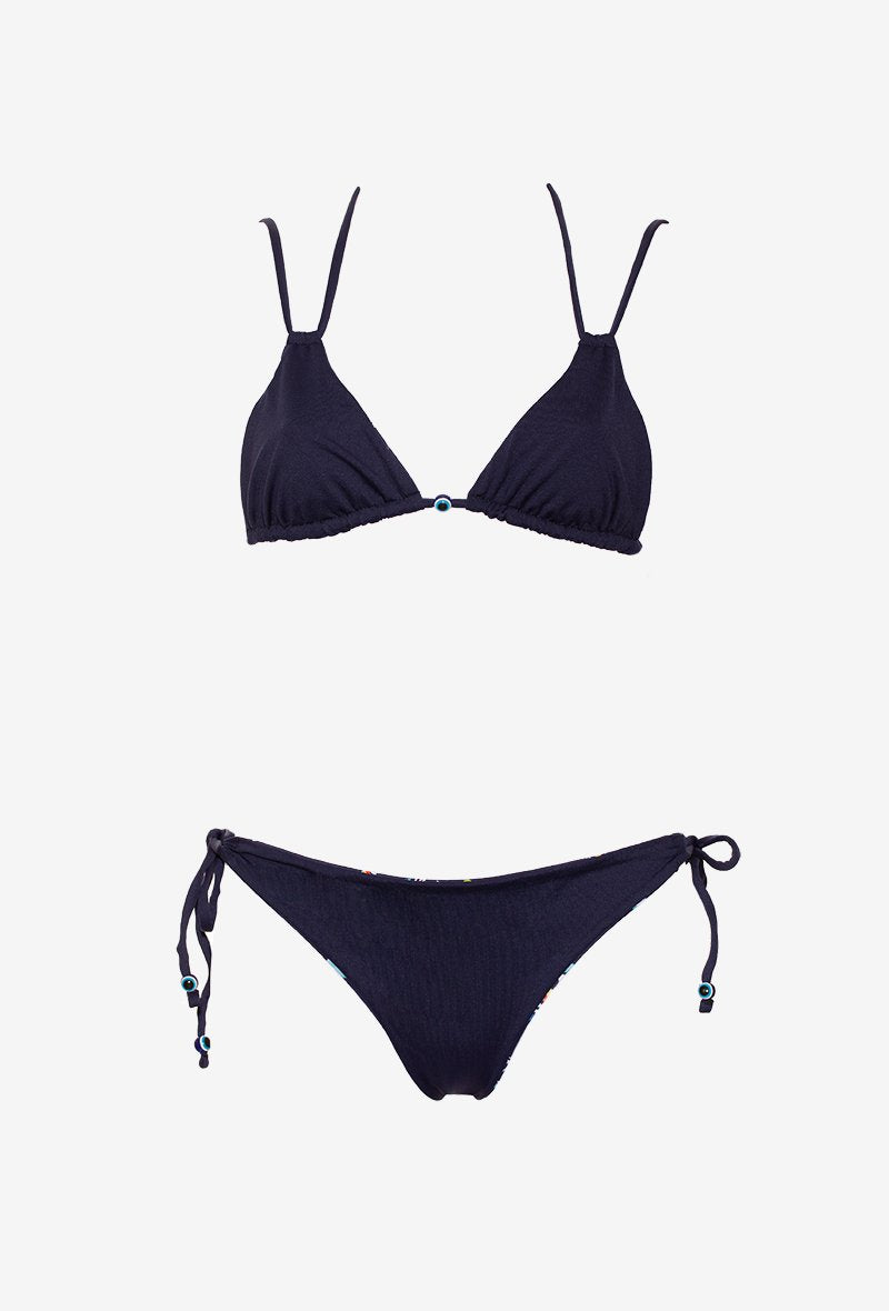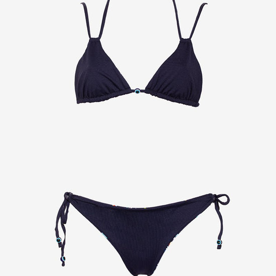 Ce maillot de bain triangle et sa culotte légèrement échancrée tirent leur originalité dans les couleurs pétillantes choisies ainsi que par les perles qui rappellent l’œil qui est souvent dessiné par l’artiste. Le maillot de bain est entièrement réversible, pour choisir le côté imprimé ou uni selon votre préférence, vous permettant d’avoir plusieurs combinaisons possibles avec un seul maillot de bain. Ajustable par les ficelles, il s'ajuste parfaitement pour un confort optimal.