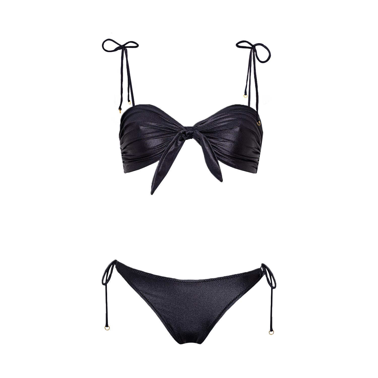 Le fini pailleté de ce bikini noir est indéniablement empreint d'une nostalgie envers les années 2000. Ce bas de maillot dispose d'une culotte mi-haute ajustable avec des liens à nouer sur les hanches.