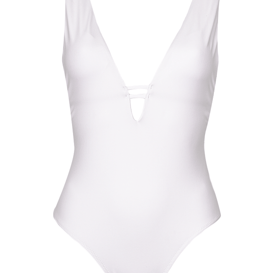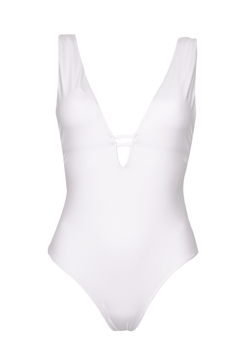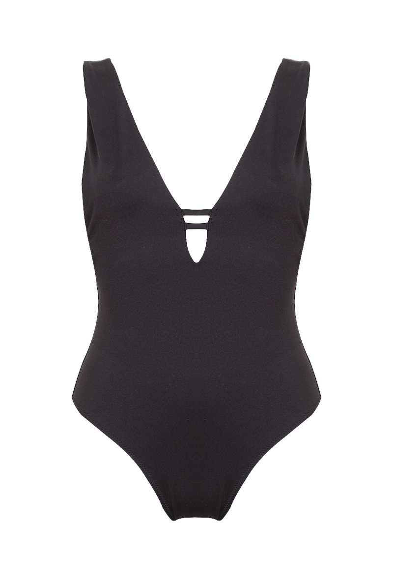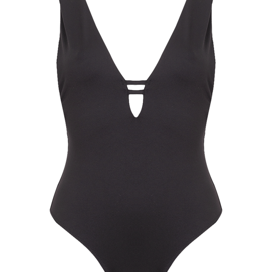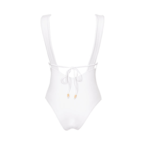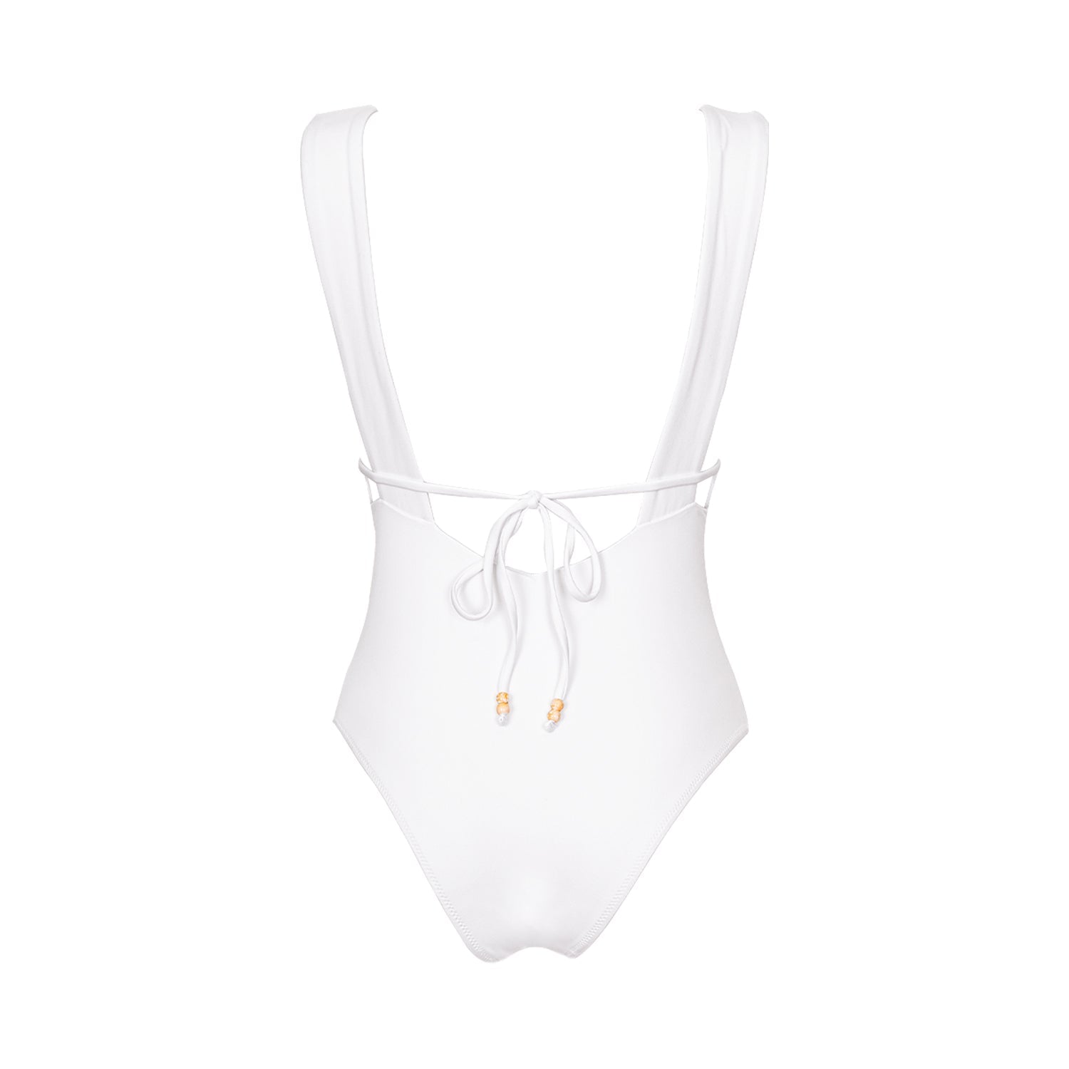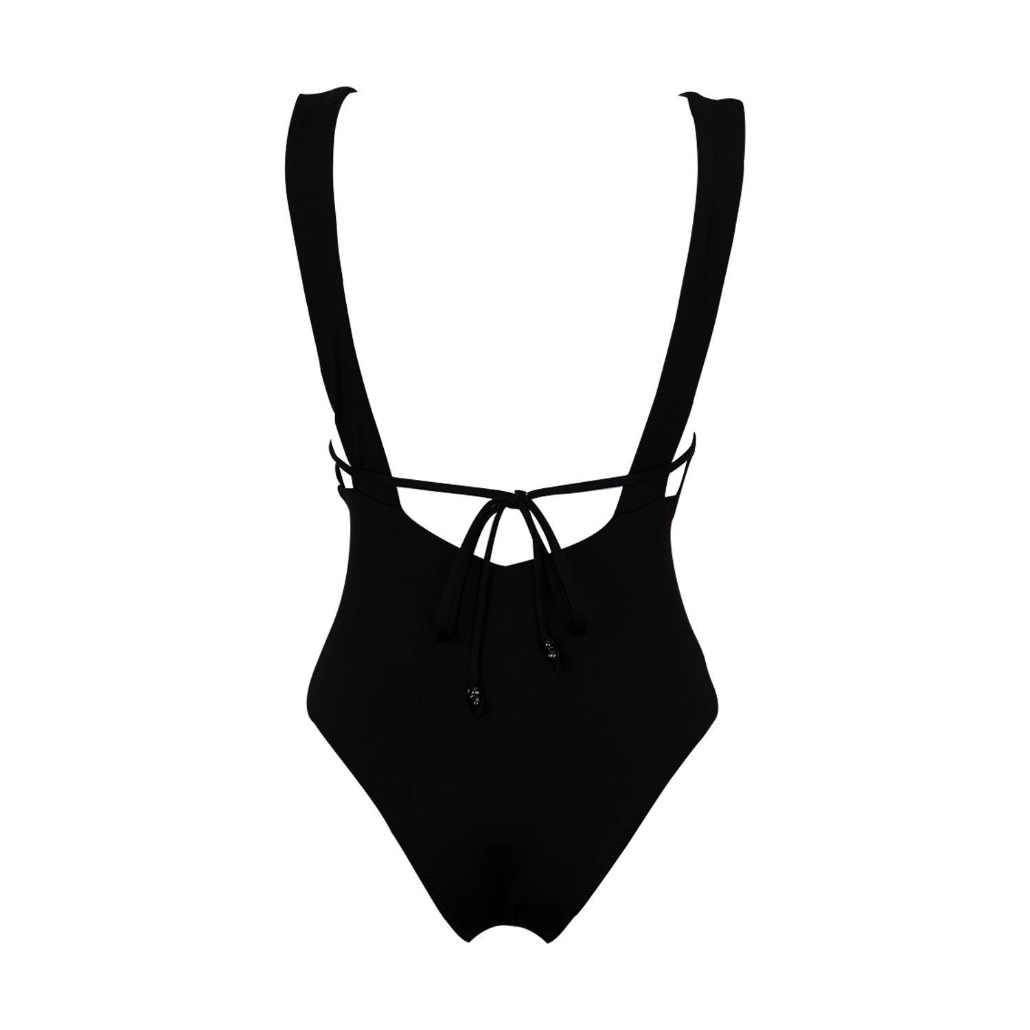 Ce maillot de bain présente un profond décolleté en V maintenu en place grâce à des élastiques au niveau de la poitrine. Ses liens à nouer au dos, vous permettront de l'ajuster parfaitement à votre silhouette.