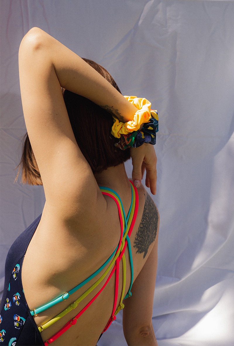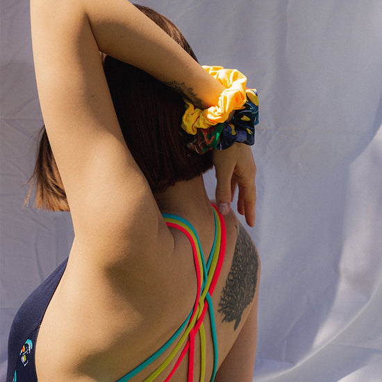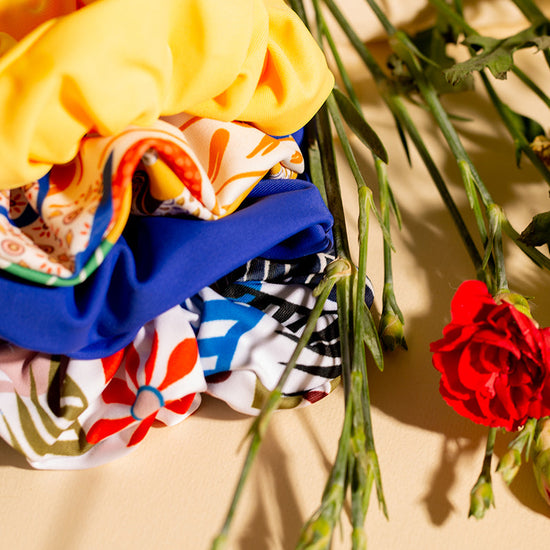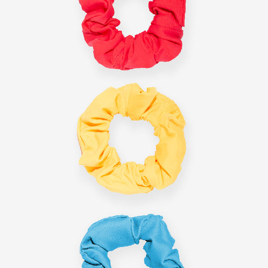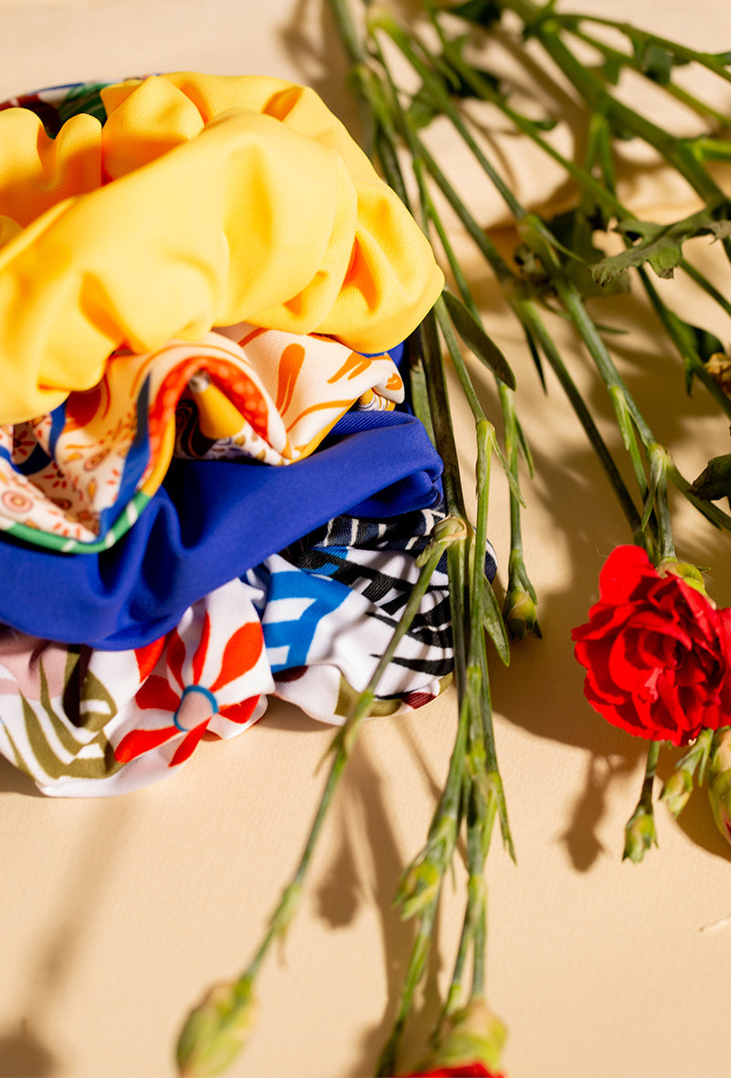 Pochette surprise ! Pour accessoiriser votre ensemble de l’été, choisissez un assemblage de 3 chouchous colorés. Pour agir contre le gaspillage, nous récoltons les chutes de la production de maillots de bain afin de créer plus de 50 modèles de chouchous originaux et colorés.